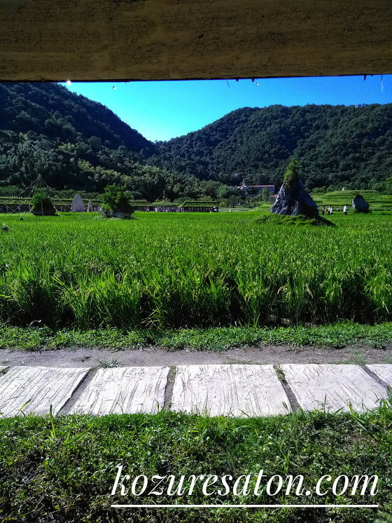 ちなみに夏場は、青々とした色合いで、目を楽しませてくれます。昨夏、ラコリーナ近江八幡に行った時に、草屋根の軒下から、上の画像の撮影場所方向にカメラを向けた画像がこちらです。